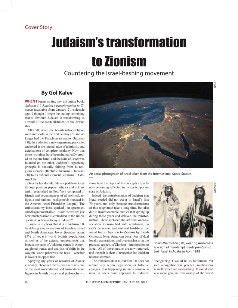 This article is based on an excerpt from the author’s book, Judaism 3.0 – Judaism’s transformation to Zionism, launched on March 7th. A limited release will begin on January 2nd on Amazon and Pomeranz bookseller in Jerusalem For more information, go to Judaism-Zionism.com.