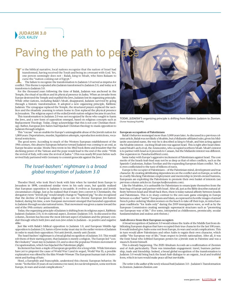 This is already happening. The 2020 Abraham Accords are a reaffirmation of Zionism and of Arab particularity. There was immediate engagement: travel, business partnership, trade and friendship. Indeed, a broad global recognition of the transformation to Judaism 3.0 would bring back the Israel-Arab dialogue to an organic, local and truthful form, which in turn would make peace all but inevitable.